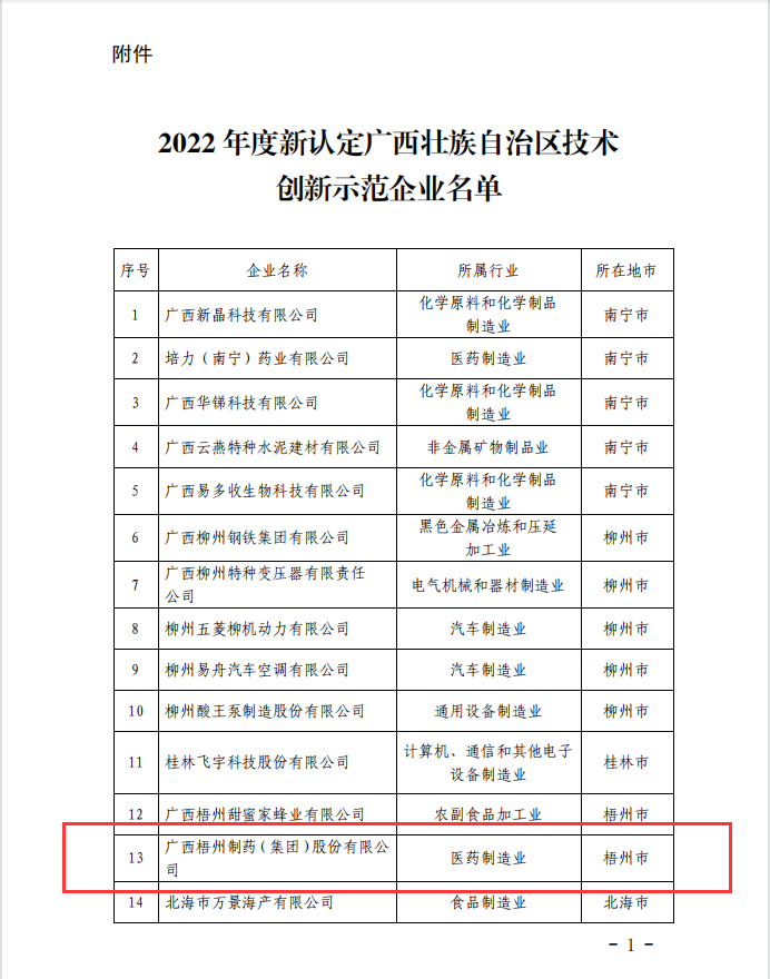 近日,廣西壯族自治區(qū)工業(yè)和信息化廳發(fā)布《自治區(qū)工業(yè)和信息化廳 自治區(qū)財政廳關(guān)于公布2022年度新認定廣西壯族自治區(qū)技術(shù)創(chuàng)新示范企業(yè)名單的通知》,梧州制藥榜上有名,獲評為2022年度“廣西壯族自治區(qū)技術(shù)創(chuàng)新示范企業(yè)”。