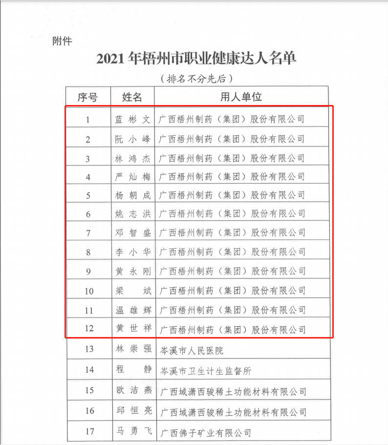 近日,梧州市衛(wèi)生健康委公布2021年度梧州市職業(yè)健康達人評選結(jié)果,梧州制藥12名職工獲得“職業(yè)健康達人”稱號。