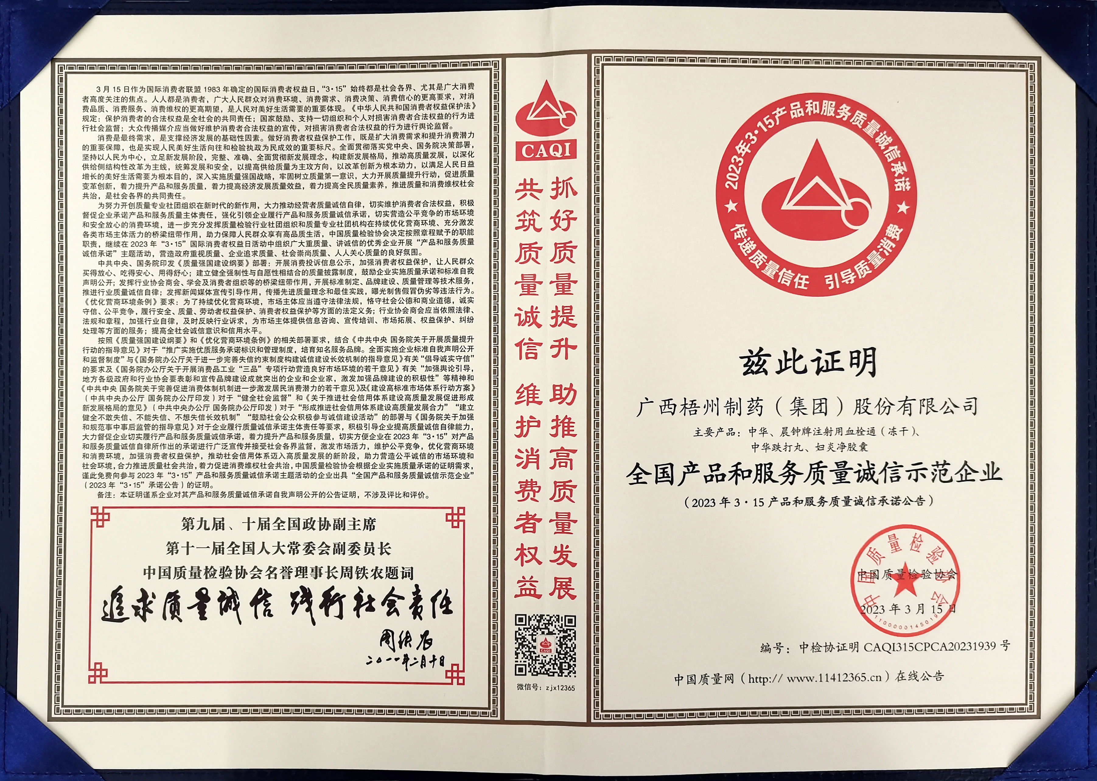 廣西梧州制藥(集團)股份有限公司榮獲2023年全國產品和服務質量誠信示范企業(yè)