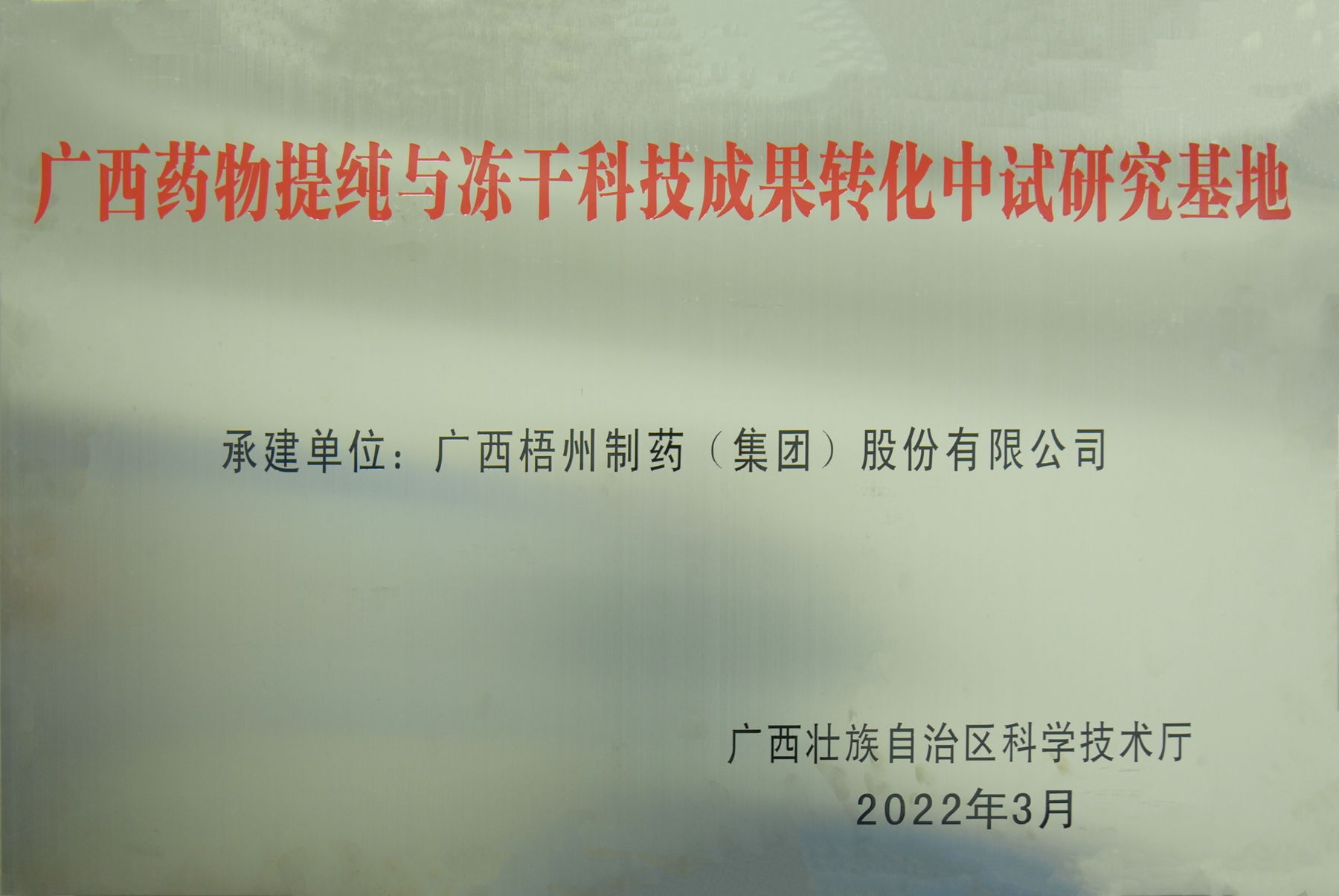 廣西梧州制藥(集團)股份有限公司評為廣西藥物提純與凍干成果轉(zhuǎn)化中試研究基地