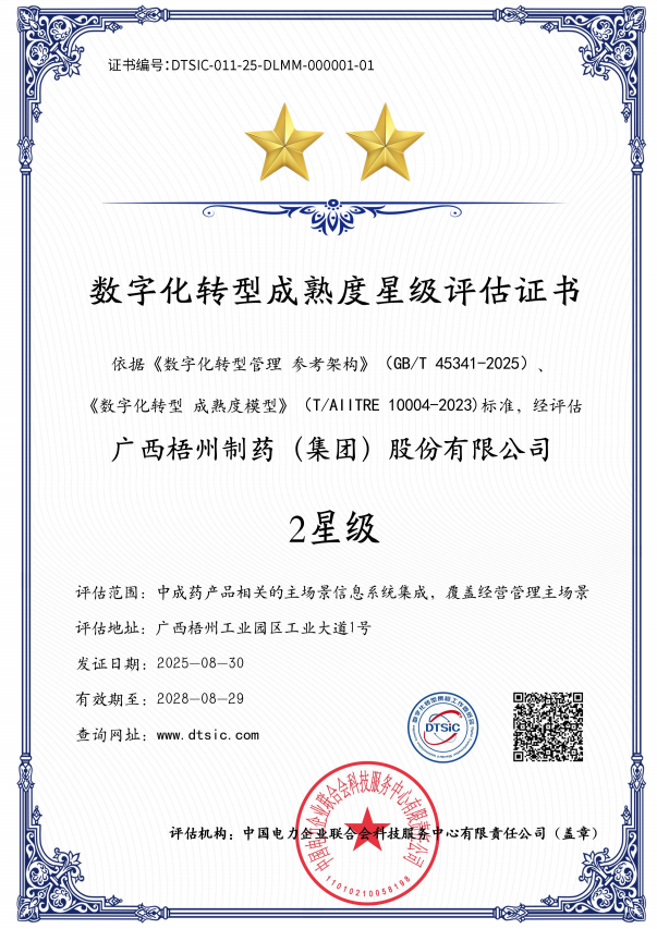 近日,數(shù)字化轉(zhuǎn)型貫標(biāo)工作委員會(huì)公布第十九批數(shù)字化轉(zhuǎn)型貫標(biāo)星級(jí)評(píng)估結(jié)果,廣西梧州制藥(集團(tuán))股份有限公司憑借扎實(shí)的轉(zhuǎn)型實(shí)踐與顯著成效,成功獲評(píng)數(shù)字化轉(zhuǎn)型成熟度2星級(jí)認(rèn)證,成為中醫(yī)藥行業(yè)數(shù)字化轉(zhuǎn)型進(jìn)程中的優(yōu)秀代表。該榮譽(yù)不僅是對(duì)企業(yè)過往轉(zhuǎn)型工作的權(quán)威認(rèn)可,更為行業(yè)同仁推進(jìn)數(shù)字化轉(zhuǎn)型提供了可參考的實(shí)踐路徑。