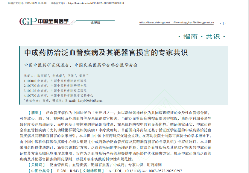 此次發(fā)布的專家共識,由葛均波院士、陳可冀院士擔任學術(shù)指導,匯聚了43位來自全國19個省、自治區(qū)、直轄市,專業(yè)領域覆蓋心血管、腦血管、腎臟、眼、外周血管及內(nèi)分泌等泛血管疾病核心方向的權(quán)威專家。